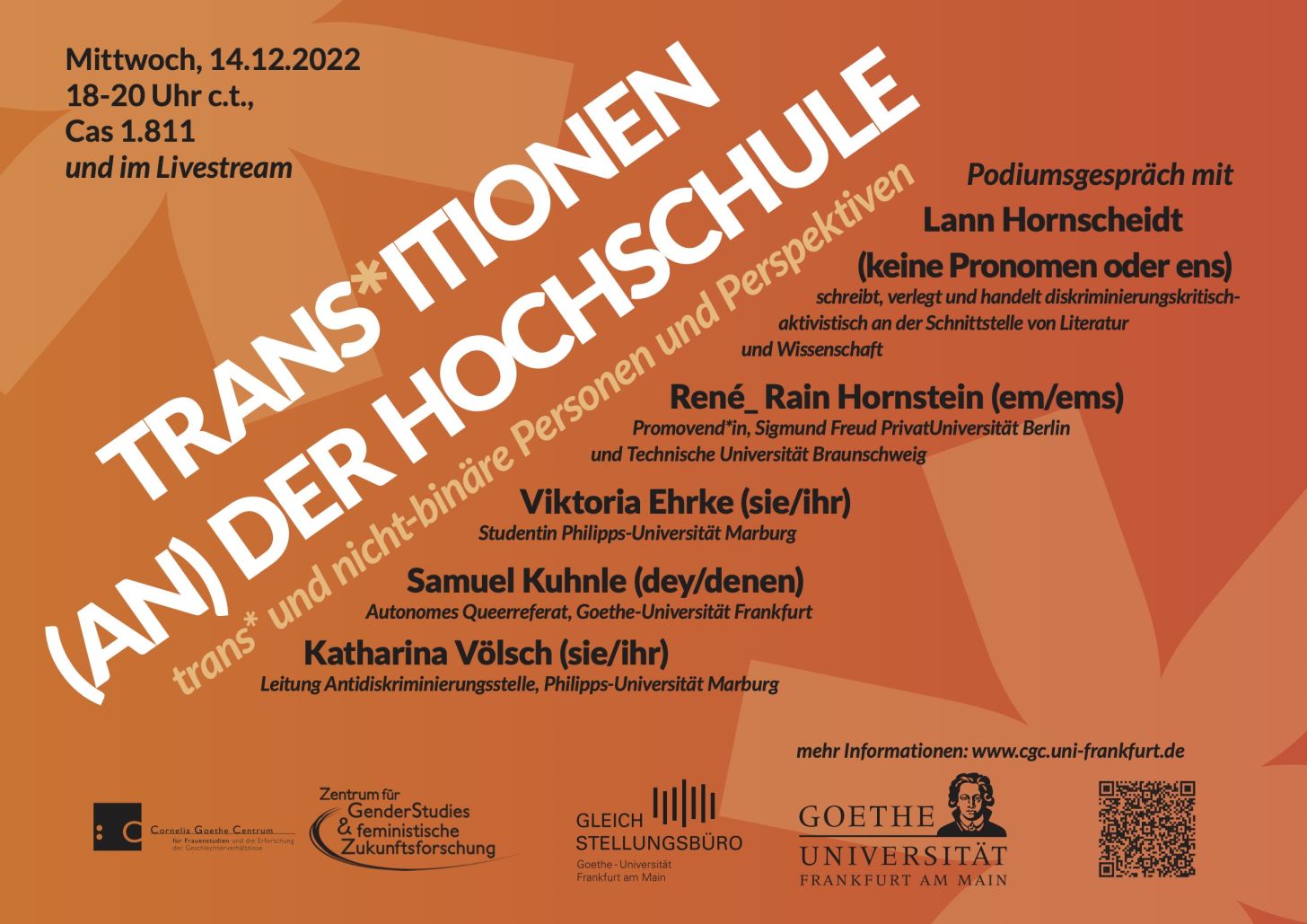 In unserem Podiumsgespräch, das im Kontext des Wissenschaftstags #4GenderStudies steht, bringen wir verschiedene trans* und nicht-binäre Personen und Perspektiven in einen Dialog, um gemeinsam zu ergründen, wie es um die Trans*itionsfähigkeit deutscher Hochschulen bestellt ist. Am Gespräch nehmen teil: