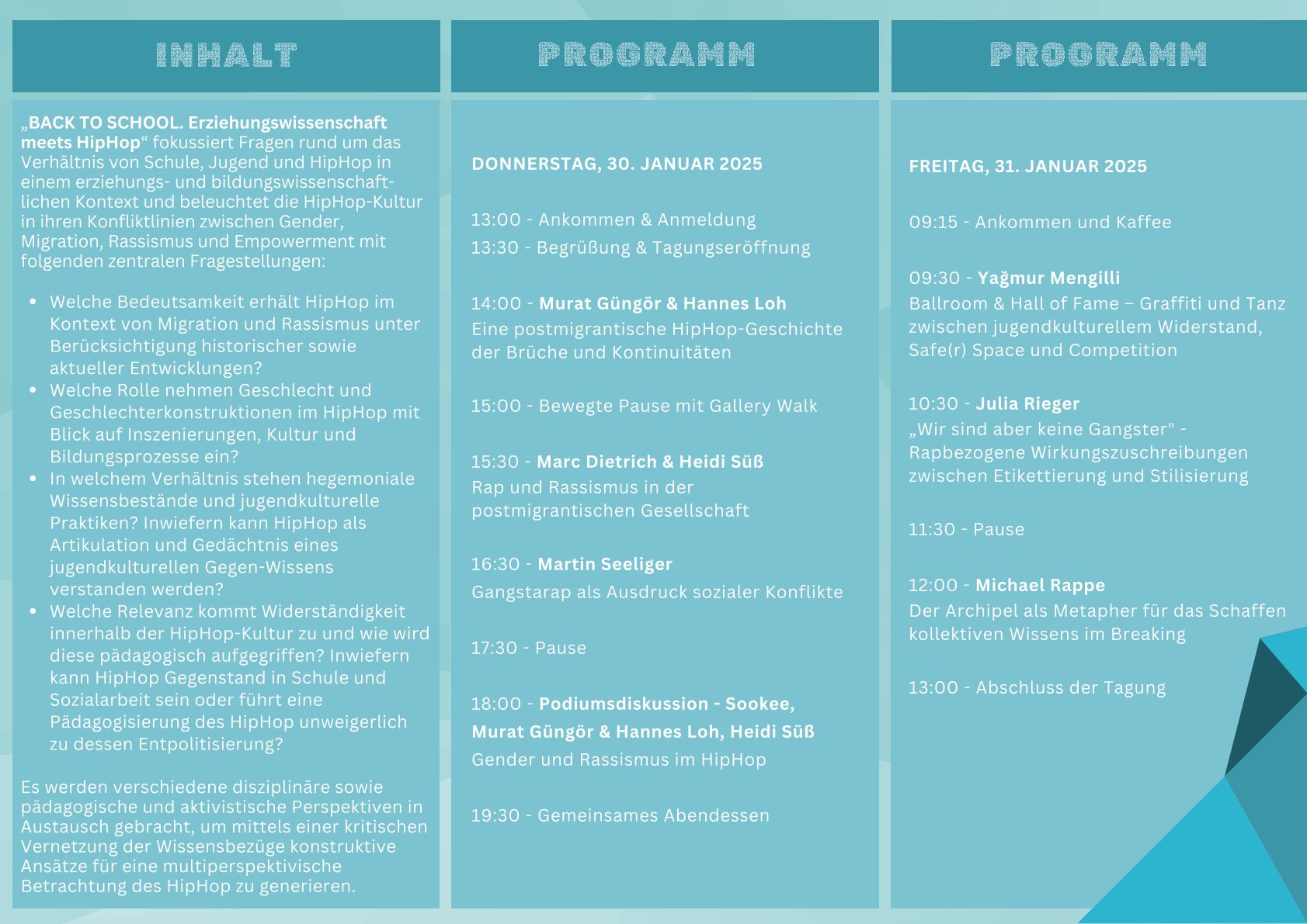 Die Tagung „BACK TO SCHOOL. Erziehungswissenschaft meets HipHop“ findet am 30. und 31. Januar 2025 an der Goethe-Universität in Frankfurt statt. Die Tagung fokussiert Fragen rund um das Verhältnis von Schule, Jugend und HipHop in einem erziehungs- und bildungswissenschaftlichen Kontext und beleuchtet die HipHop-Kultur in ihren Konfliktlinien zwischen Gender, Migration, Rassismus und Empowerment. Interessierte sind herzlich Willkommen!
