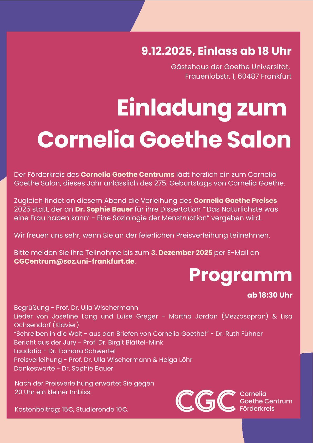 On December 9, 2025, on the occasion of Cornelia Goethe's 275th birthday, this year's Cornelia Goethe Salon will take place which will be organized by the Sponsors of the Cornelia Goethe Center. On this evening, the Cornelia Goethe Prize, worth €2,000, will be awarded for outstanding academic work in the field of women's and gender studies. This year, Sophie Bauer will receive the prize for her sociological dissertation "‘Das Natürlichste was eine Frau haben kann’ - Eine Soziologie der Menstruation".