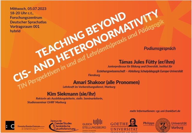 In Schule und anderen pädagogischen Kontexten spielen Geschlechter(-Verhältnisse) eine zentrale Rolle. Sie strukturieren den (Schul-/Bildungs)alltag, werden verhandelt, erprobt und diskutiert. Dabei gehören die Perspektiven von trans*, inter und non-binären Personen weiterhin nicht selbstverständlich dazu, sind Gegenstand von konservativen Widerständen oder emanzipatorischen Praxen, die von den Rändern ausgehen. In dieser Podiumsdiskussion wollen wir mit den Beitragenden TIN-Perspektiven auf Lehr(amts)praxis und Pädagogik in den Mittelpunkt stellen und ausloten wie ein „Teaching beyond Cis- HeteroNormativity“ aussehen kann, welche Ressourcen dafür benötigt werden und welche Herausforderungen und Potentiale bestehen. Wie steht es um die Perspektive von Lehrenden und Lernenden, die nicht in der Zweigeschlechterordnung repräsentiert werden? Wie lässt sich Etablierung und Integration von TIN-Perspektiven in Lehrpläne, Lehramtsausbildung und pädagogische Praxis beschreiben? Welche Widerstände gibt es gegen die Thematisierung von Cis-/Heteronormativität? Wie werden TIN-Personen und -Perspektiven im schulischen Kontext und pädagogischen Praxen ein- und ausgeschlossen?